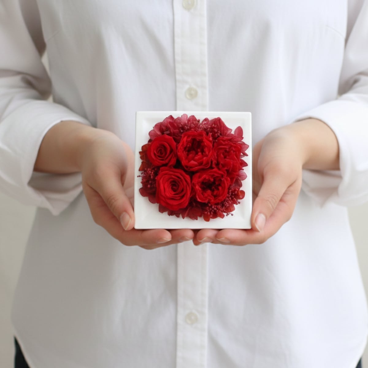 お手入れ不要で美しさが続く、贅沢なプリザーブドフラワーをミニフレームに詰め込みました。