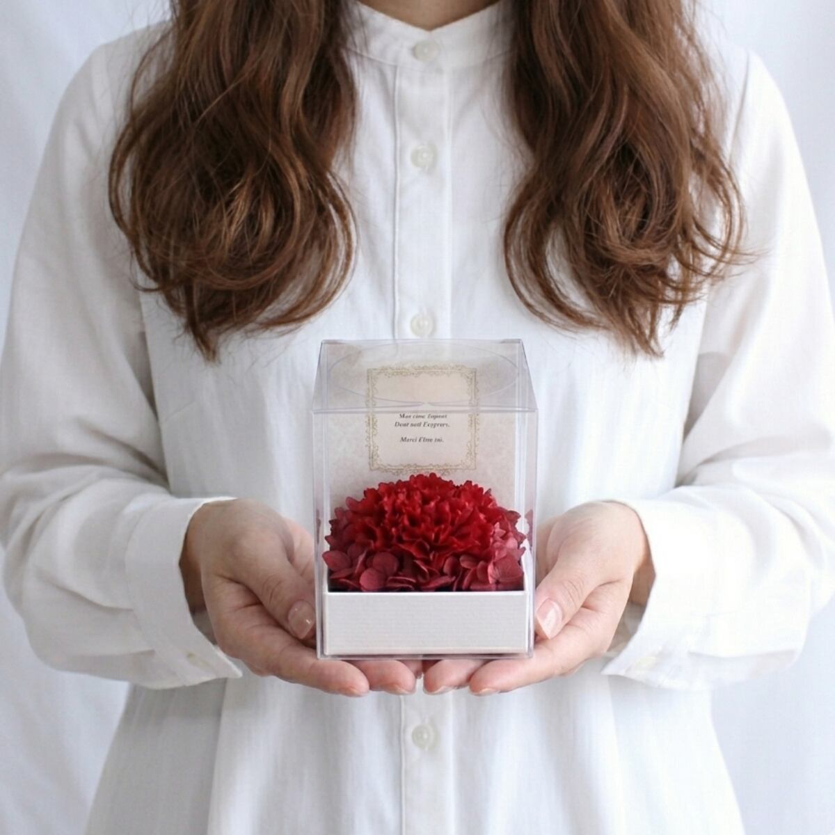 プリザーブドフラワーの上品な赤カーネーションを、クリアケースに閉じ込めた華やかなアレンジメントです。