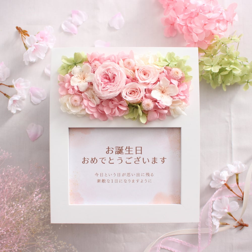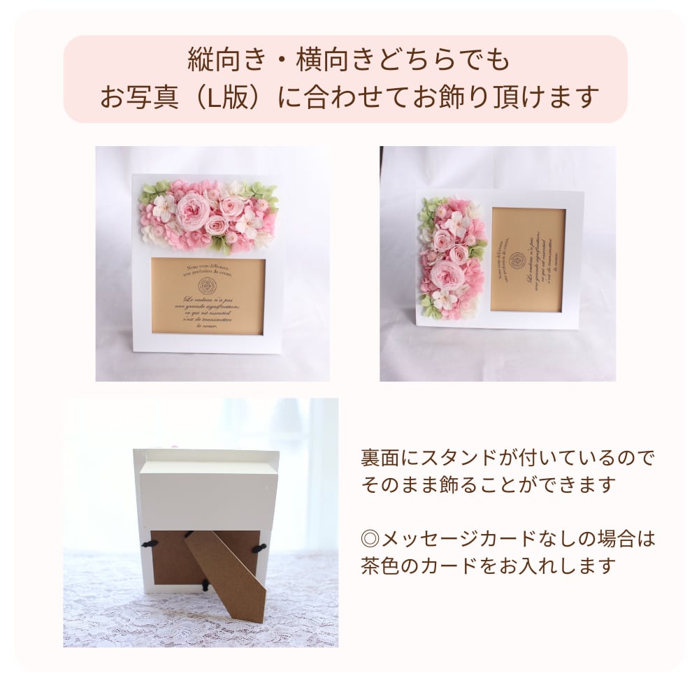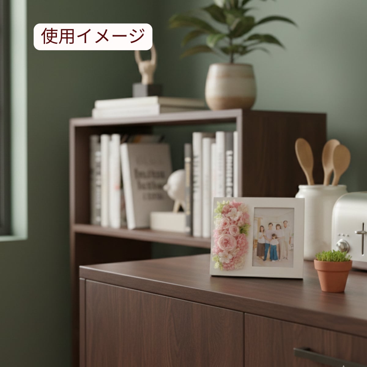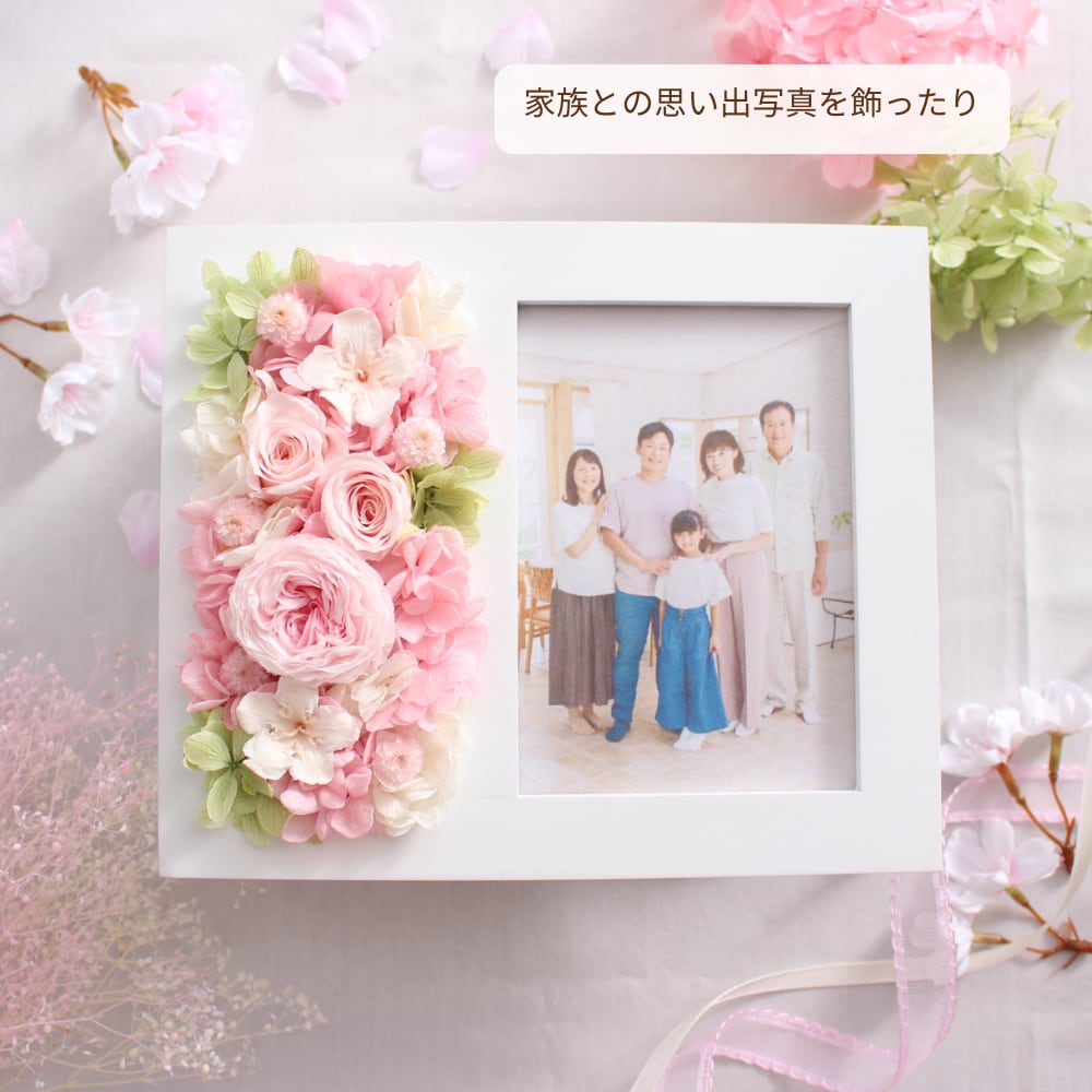プリザーブドフラワーと写真を飾れる、華やかなフラワーフォトフレームです。
