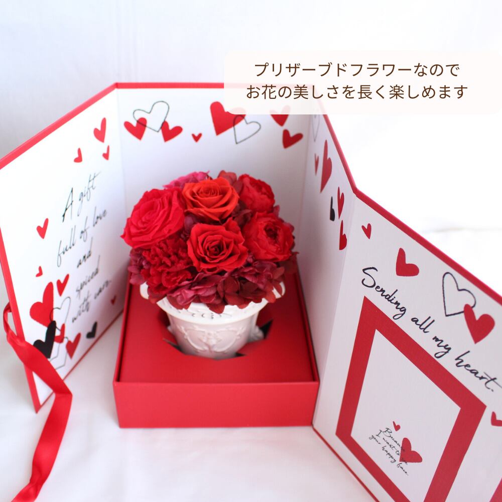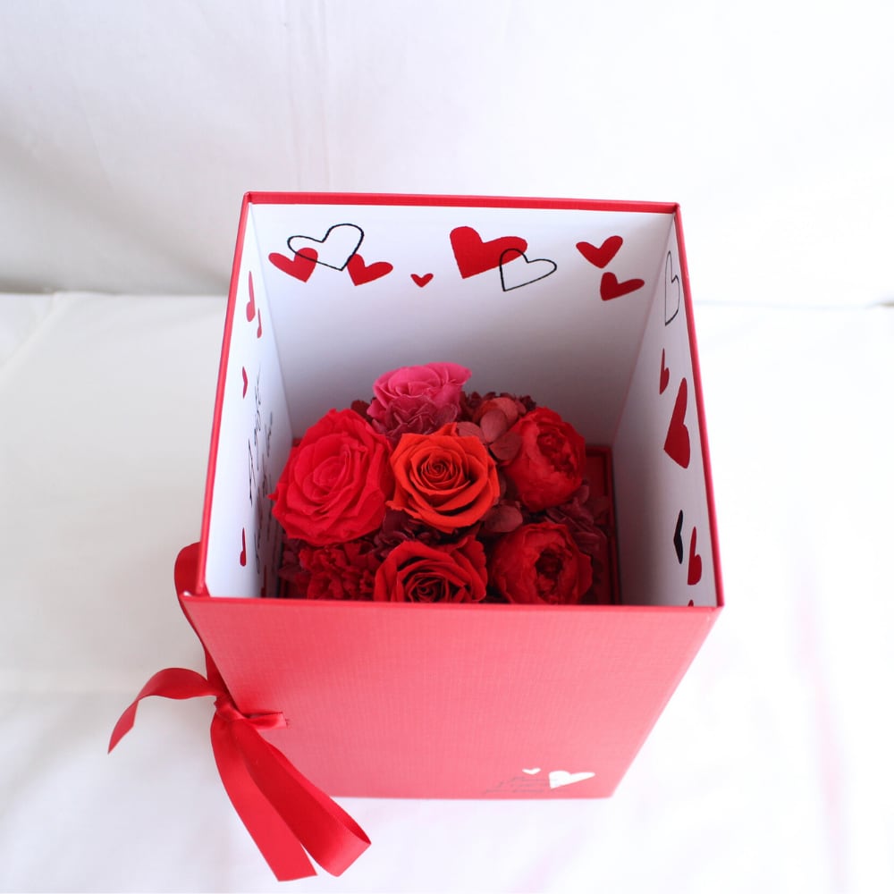 蓋を開けた瞬間に広がる真っ赤なプリザーブドフラワーが、