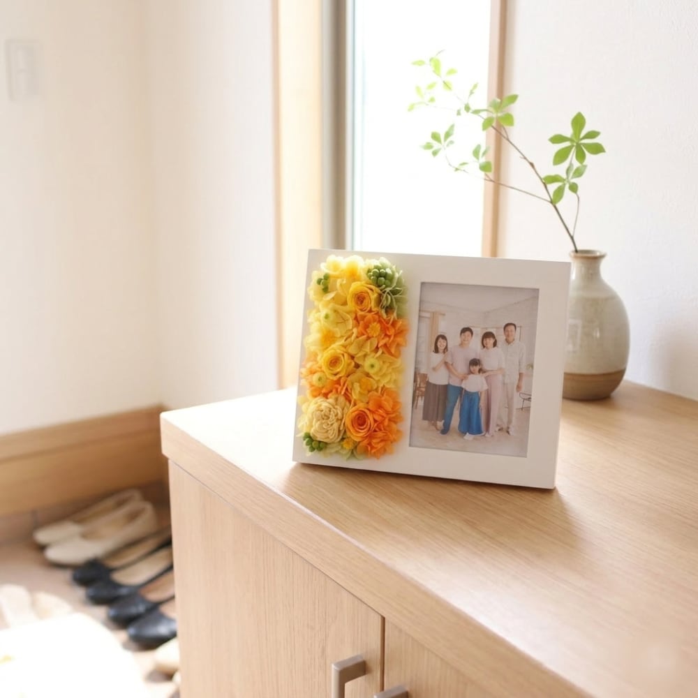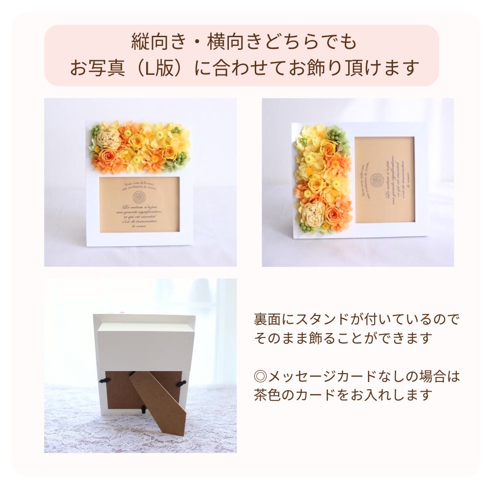 プリザーブドフラワーと写真を飾れる、華やかなフォトフレームです。