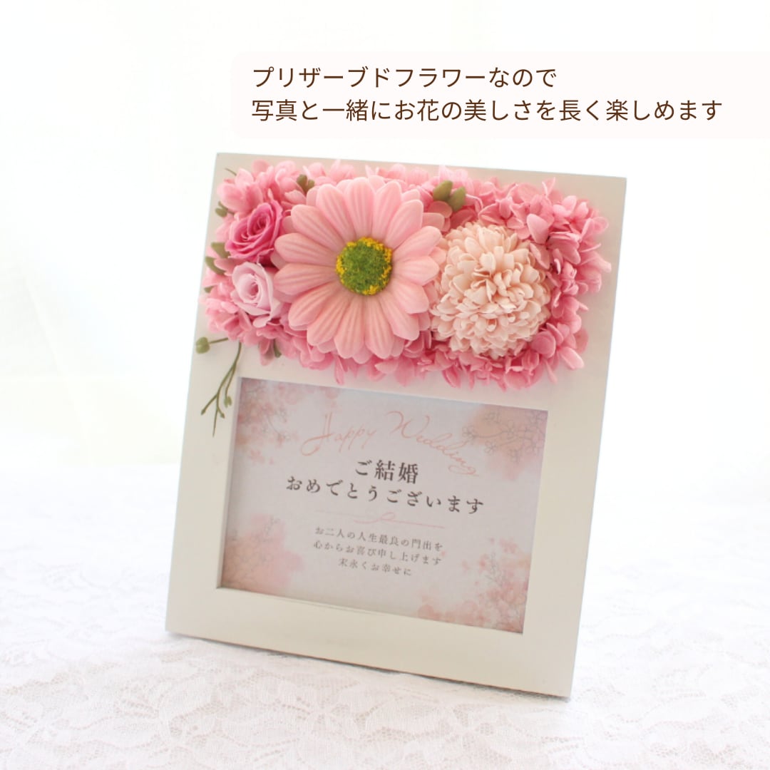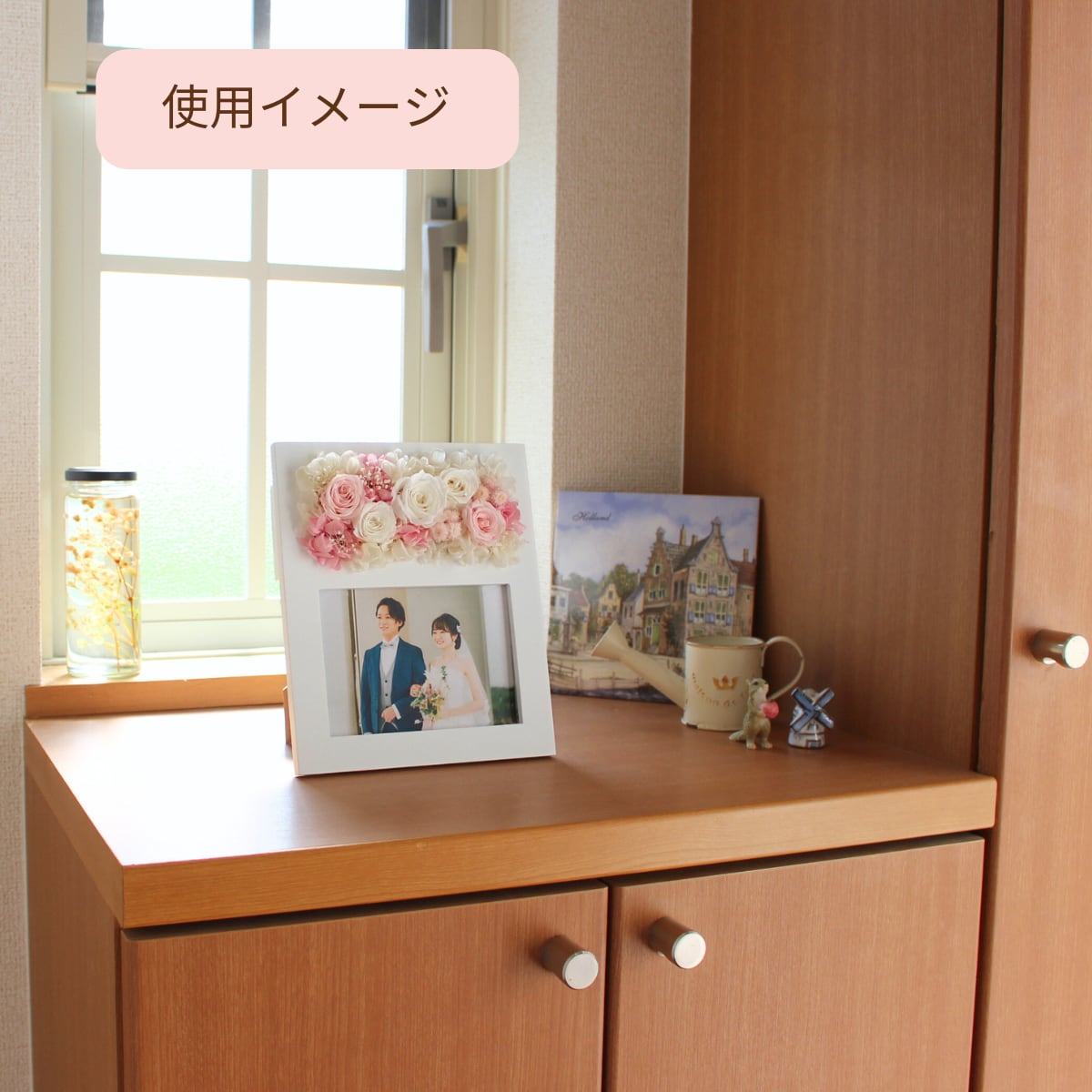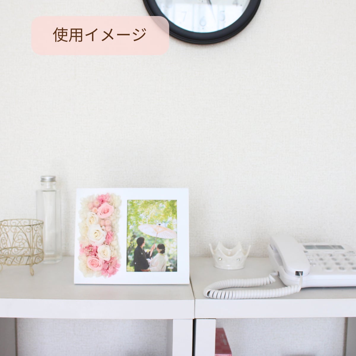 プリザーブドフラワーと写真を飾れる、華やかなフォトフレームです。