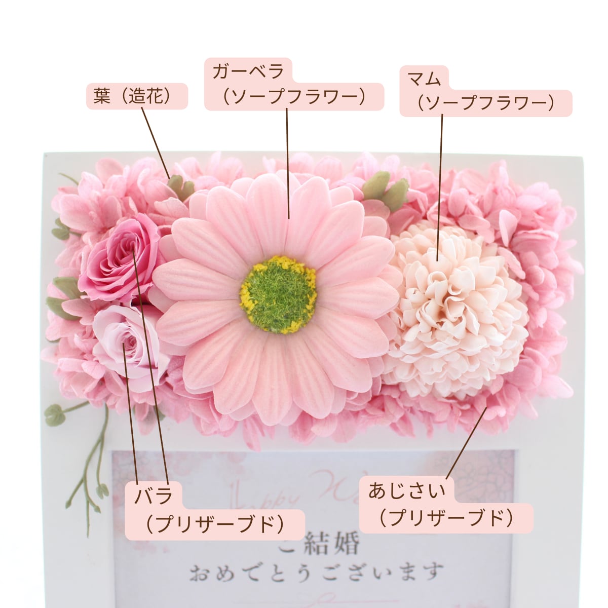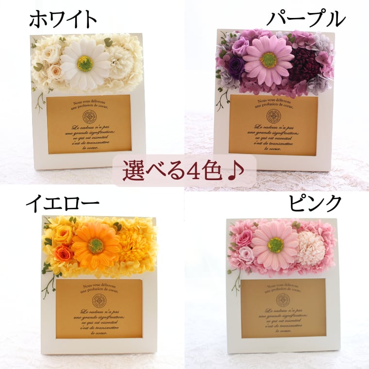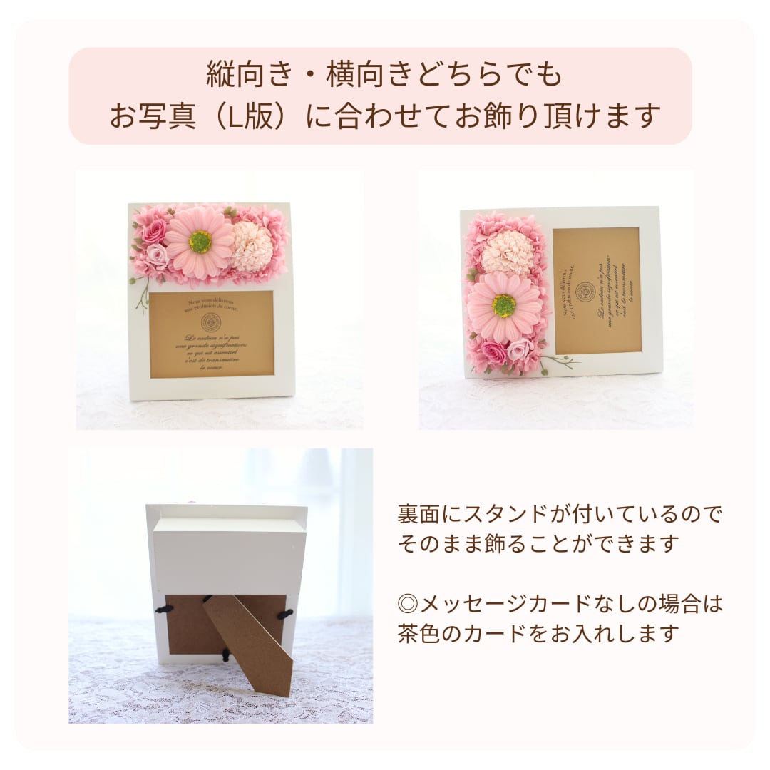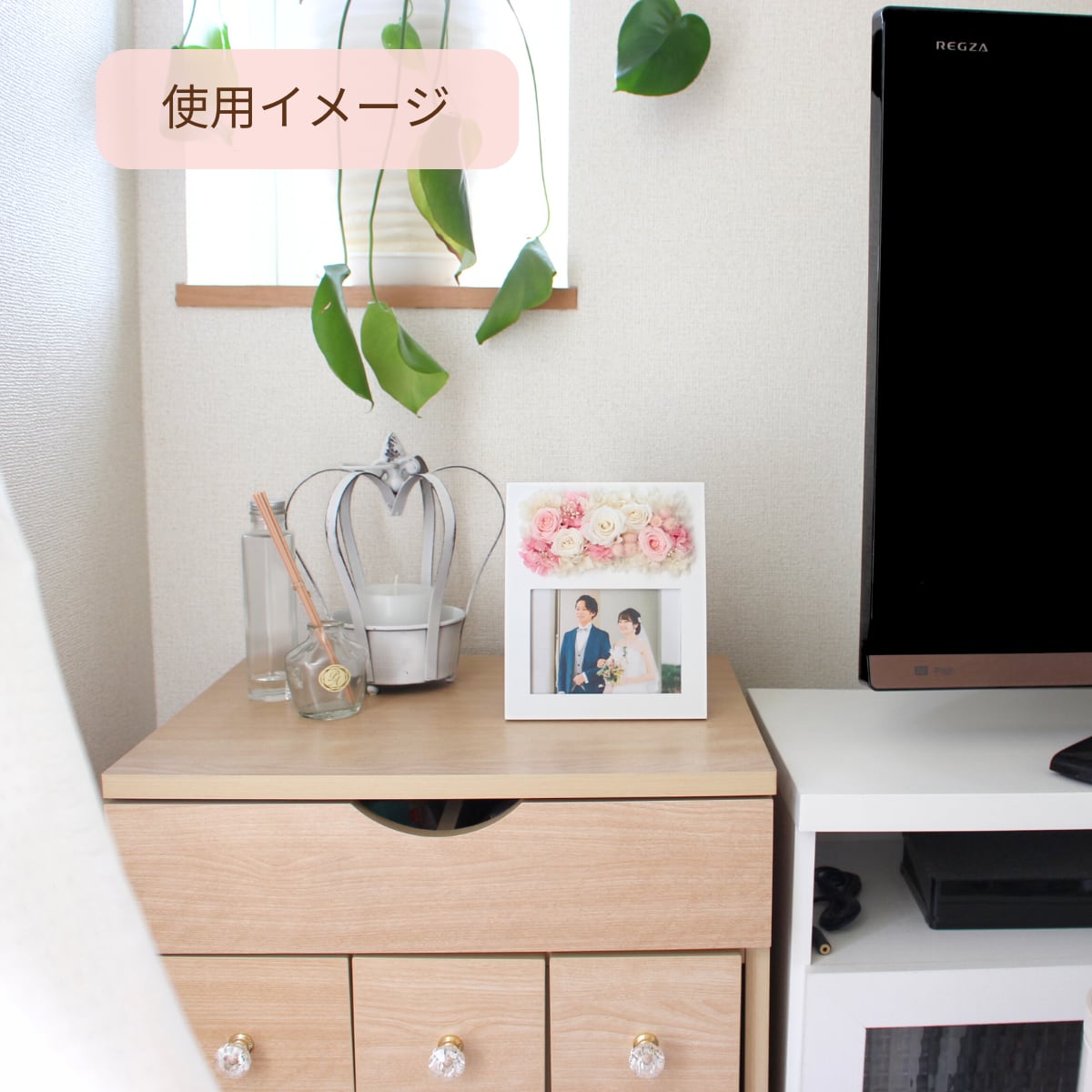 プリザーブドフラワーと写真を飾れる、華やかなフォトフレームです。