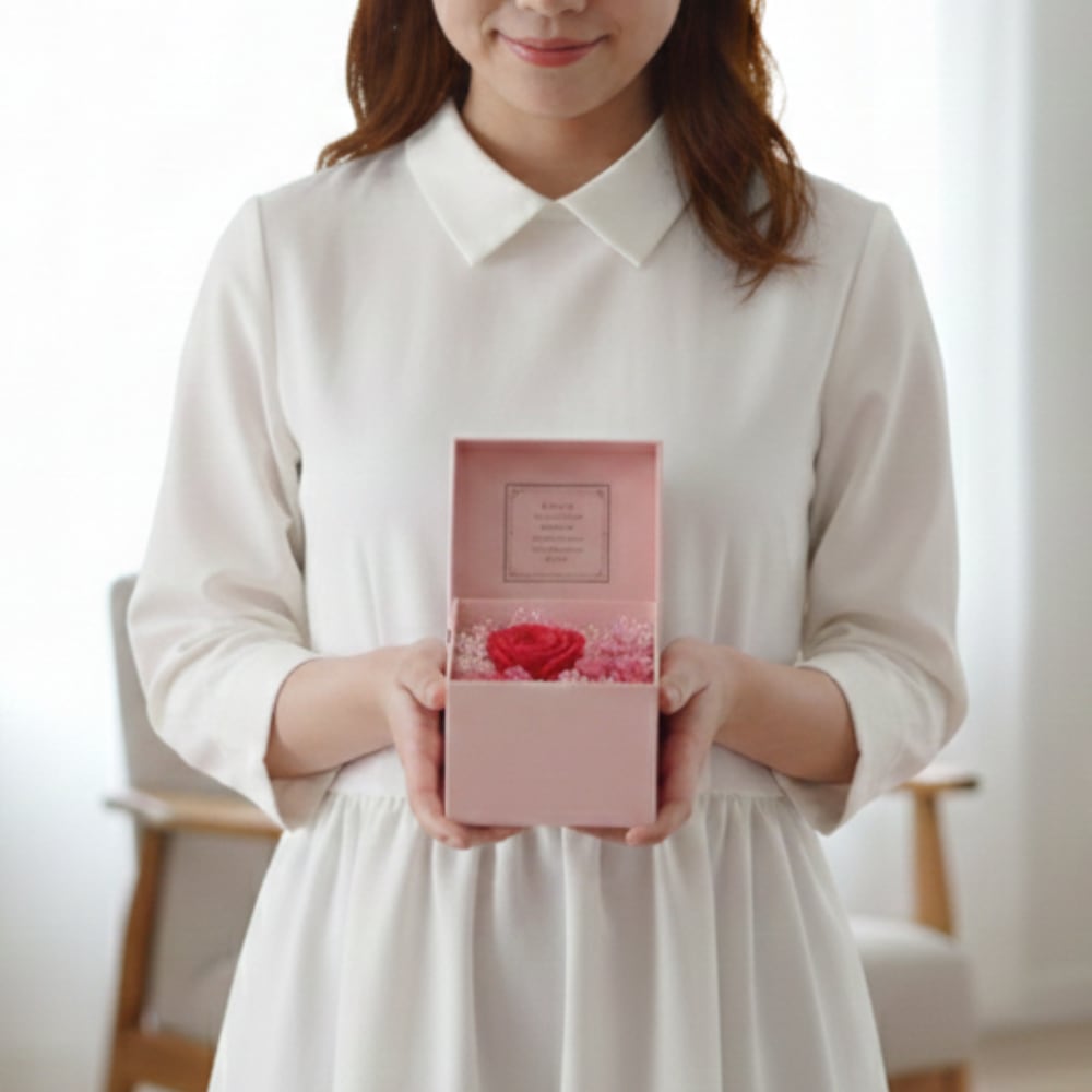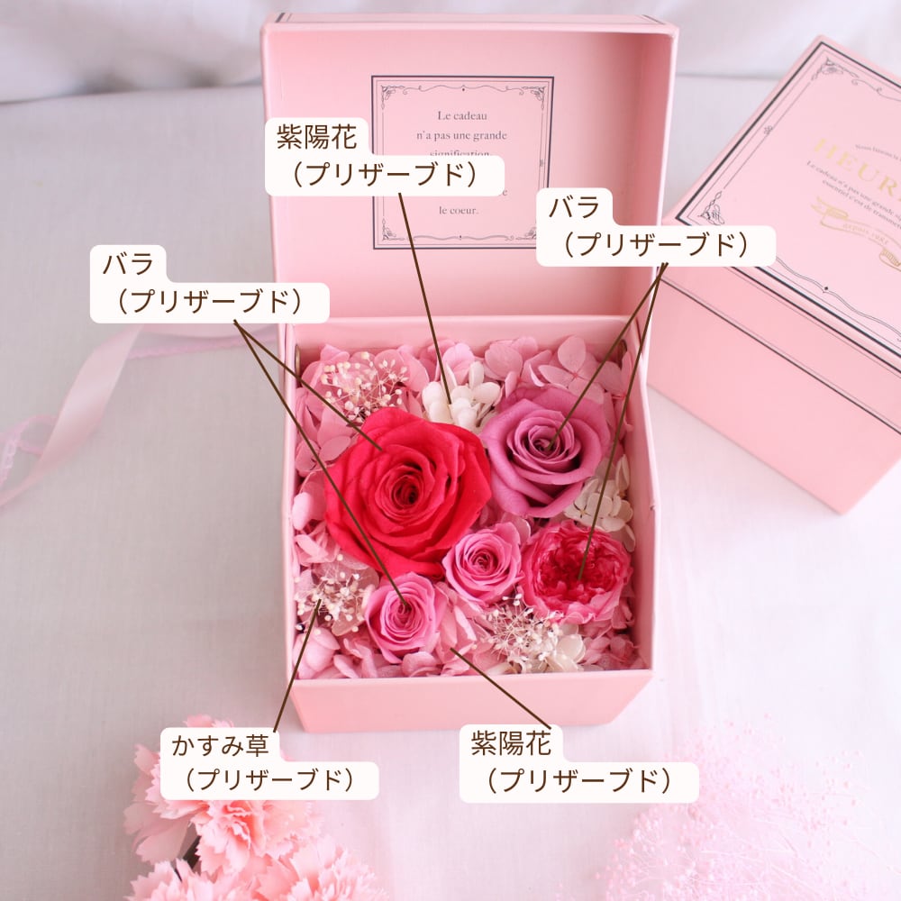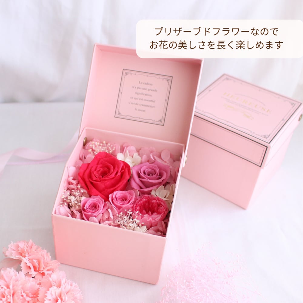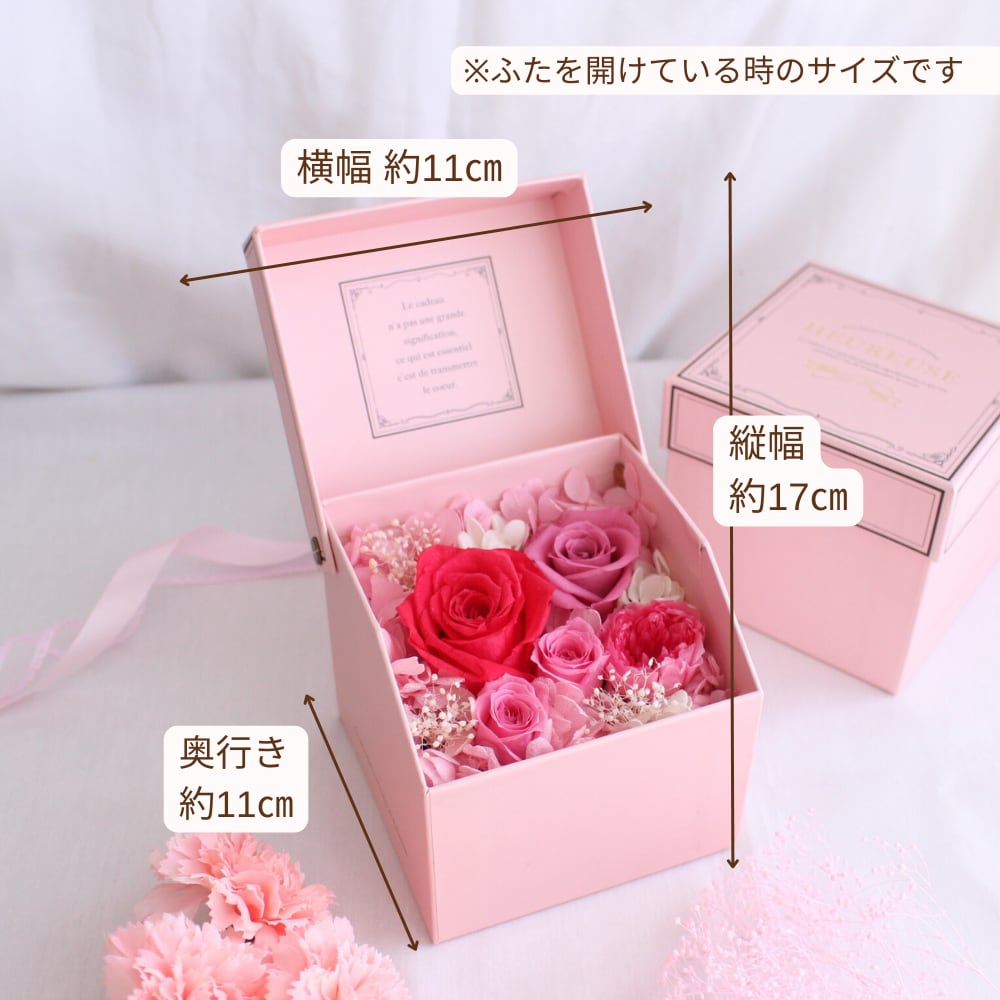 永遠に咲く花に、感謝の気持ちを込めたピンクのボックスアレンジです。