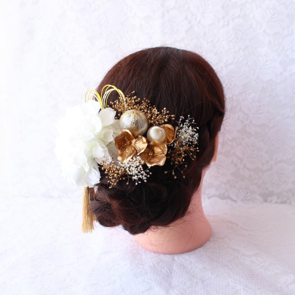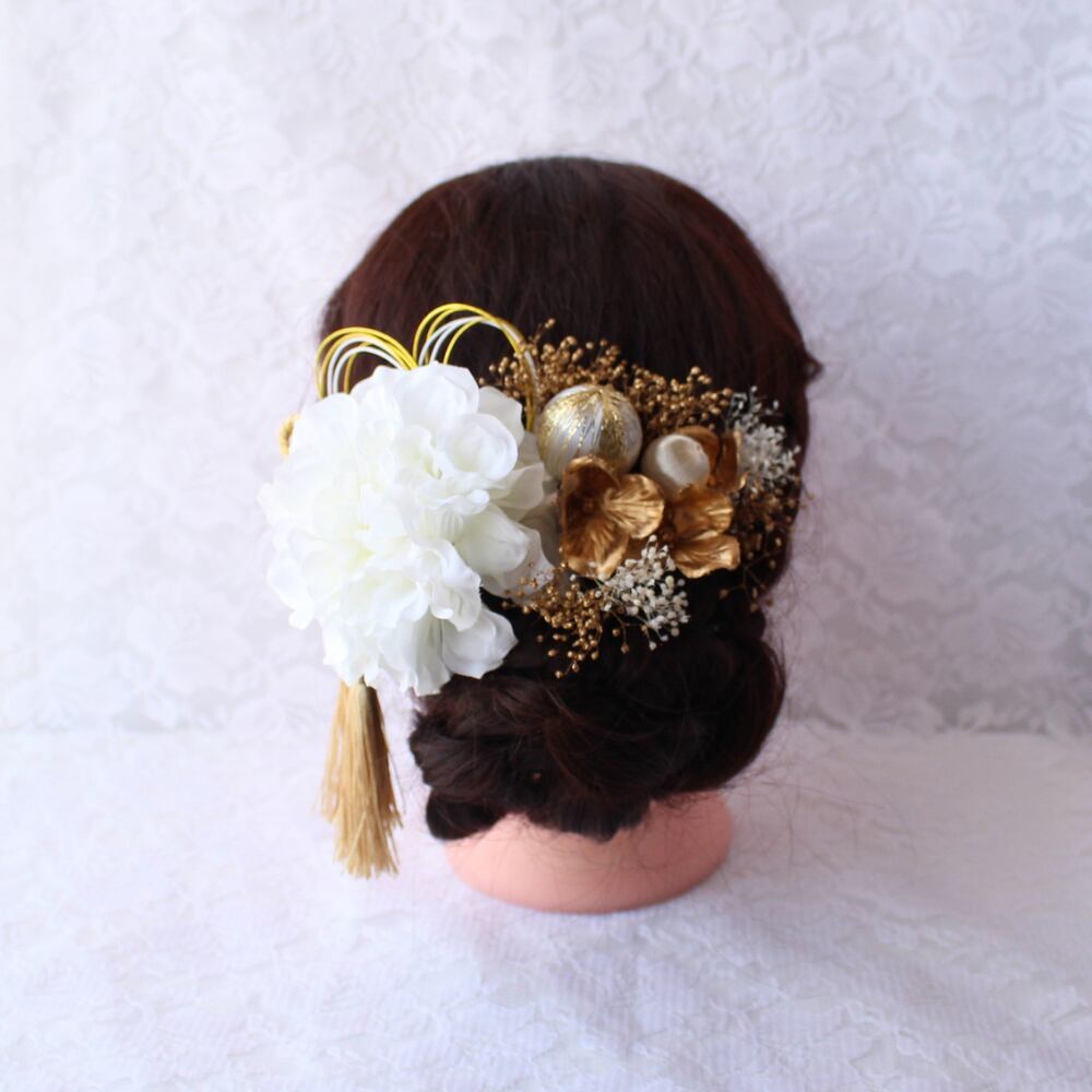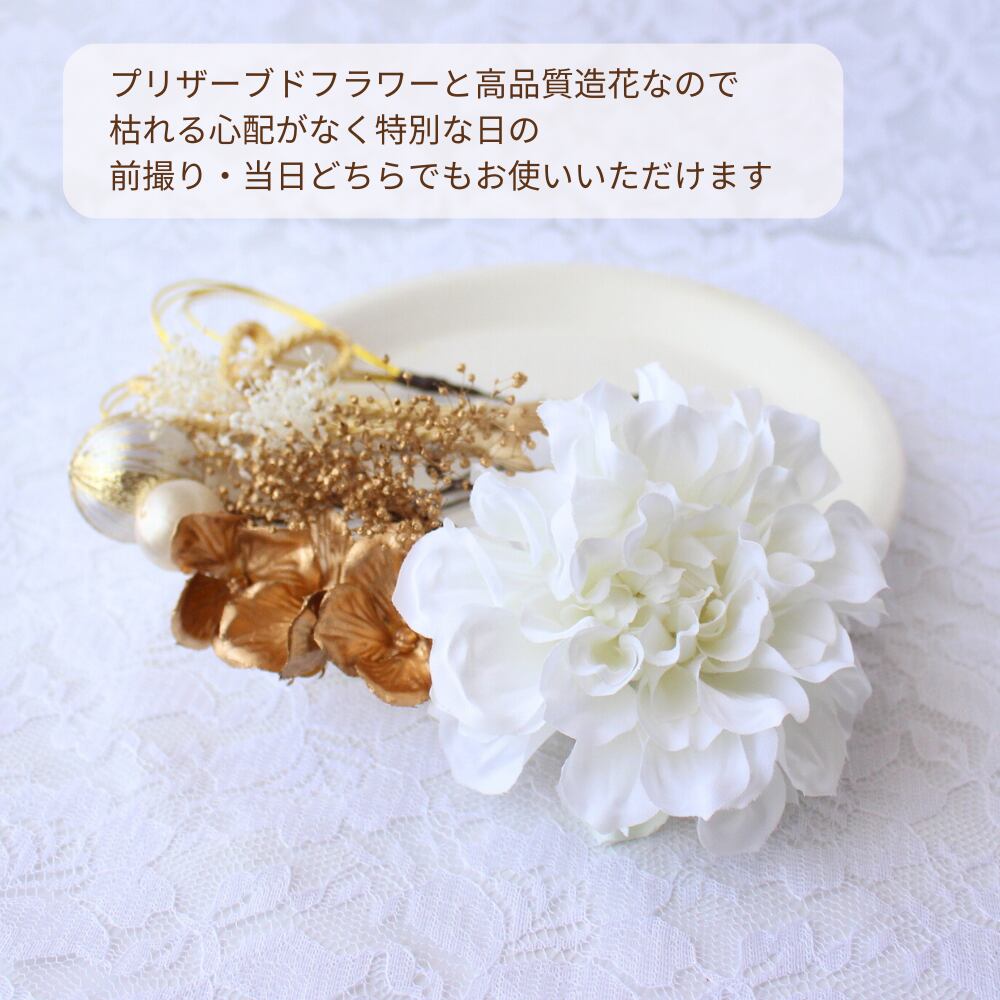 【送料無料】白ダリアの髪飾り【Uピン変更可】 卒業式 成人式 結婚式 前撮り プリザーブドフラワー ヘッドドレス 和装 花 髪かざり ホワイト ゴールド 造花 袴