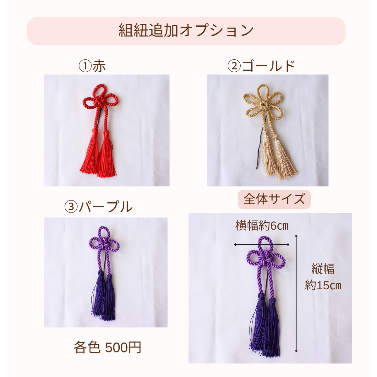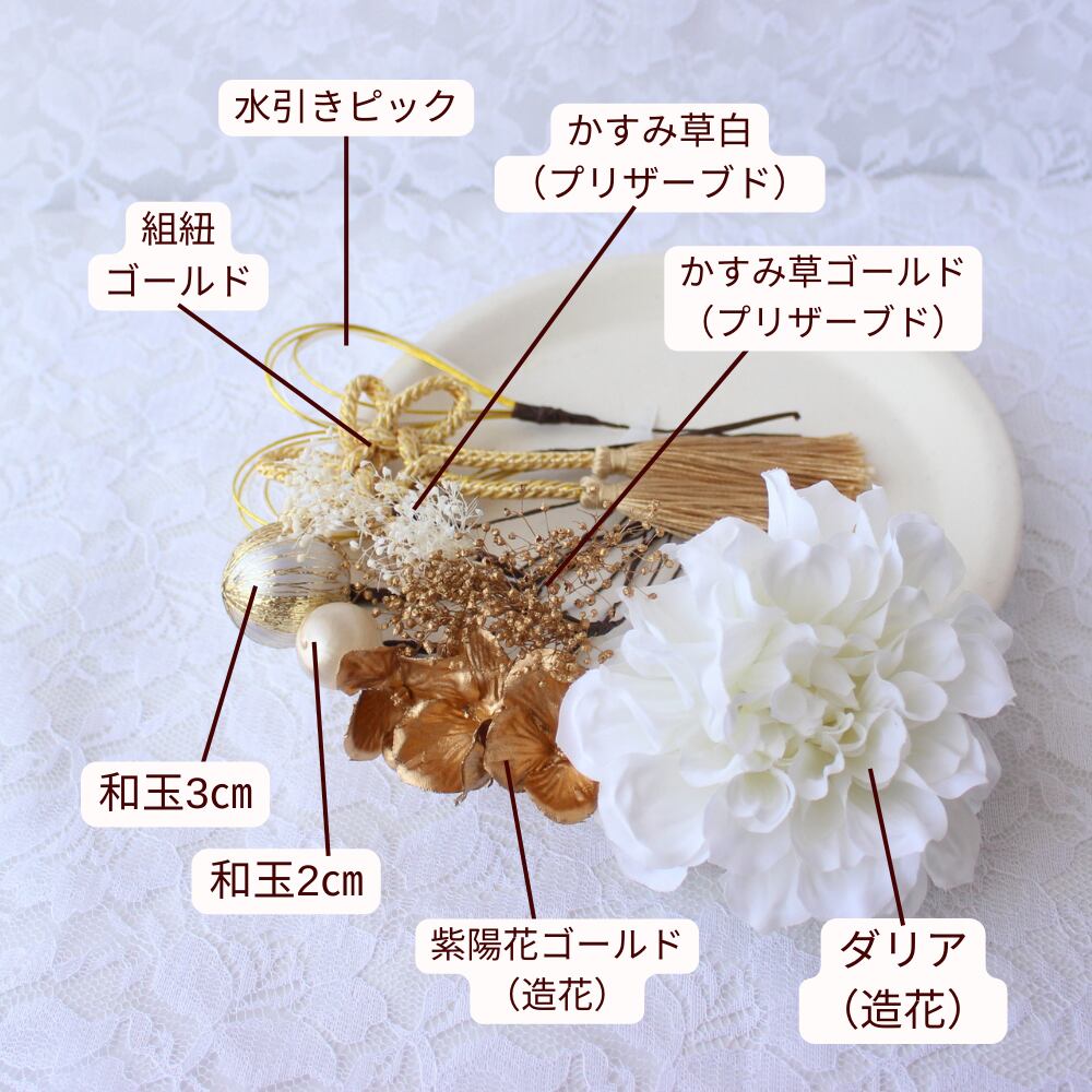 オプションでかすみ草やタッセルを追加し、さらに華やかに仕上げることができます。