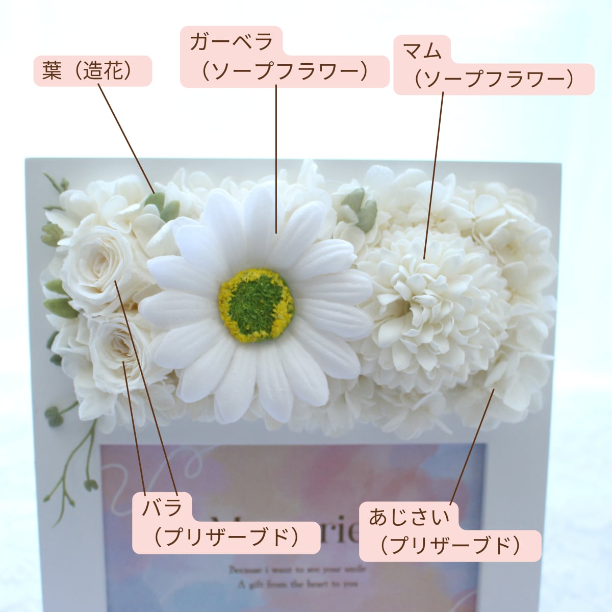 お花のフォトフレームは、華やかなお花もプレゼントになります。